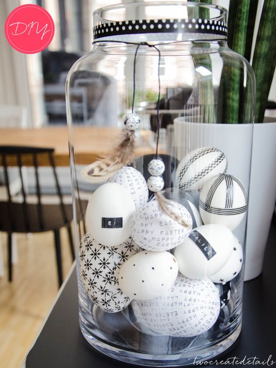 Volete creare un vaso di Pasqua più moderno e innovativo? Decorate le uova con scritte, motivi geometrici o etichette e impreziosite il contenitore con un nastrino dal design grintoso.