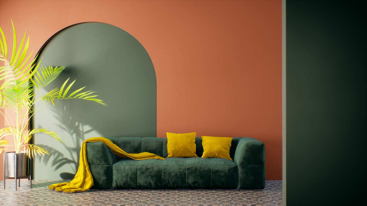 Per i divani potete anche provare ad accostare colori scuri. Come, ad esempio, nell’immagine di questo soggiorno retrò moderno con muro verde e arancione arredato con un divano dal tessuto verde scuro e cuscini ocra.
