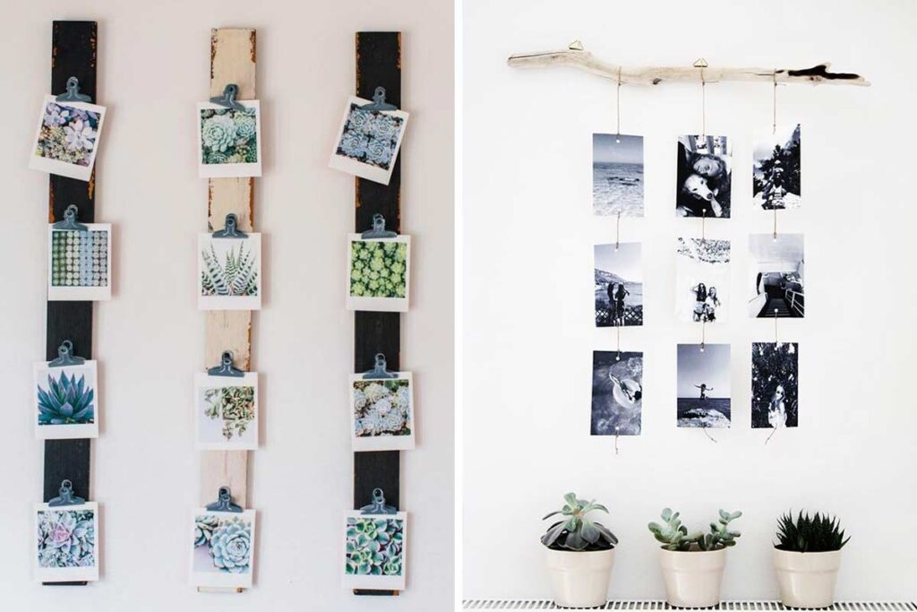 Un’idea molto carina per mettere le foto su parete senza cornice, è quella di appenderle con uno spago e delle mollette a un tronco. Si tratta di un design molto semplice che vi permetterà di cambiare le foto ogni volta in cui vogliate, senza dover per forza usare le cornici. Guardate gli esempi qui di seguito e copiate quello che preferite.