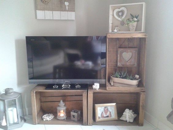 Che ne dite di realizzare un originale mobile TV con vecchie cassette di legno recuperate? In questo modo, avrete il vantaggio di progettarlo come meglio si addice al vostro soggiorno di casa.