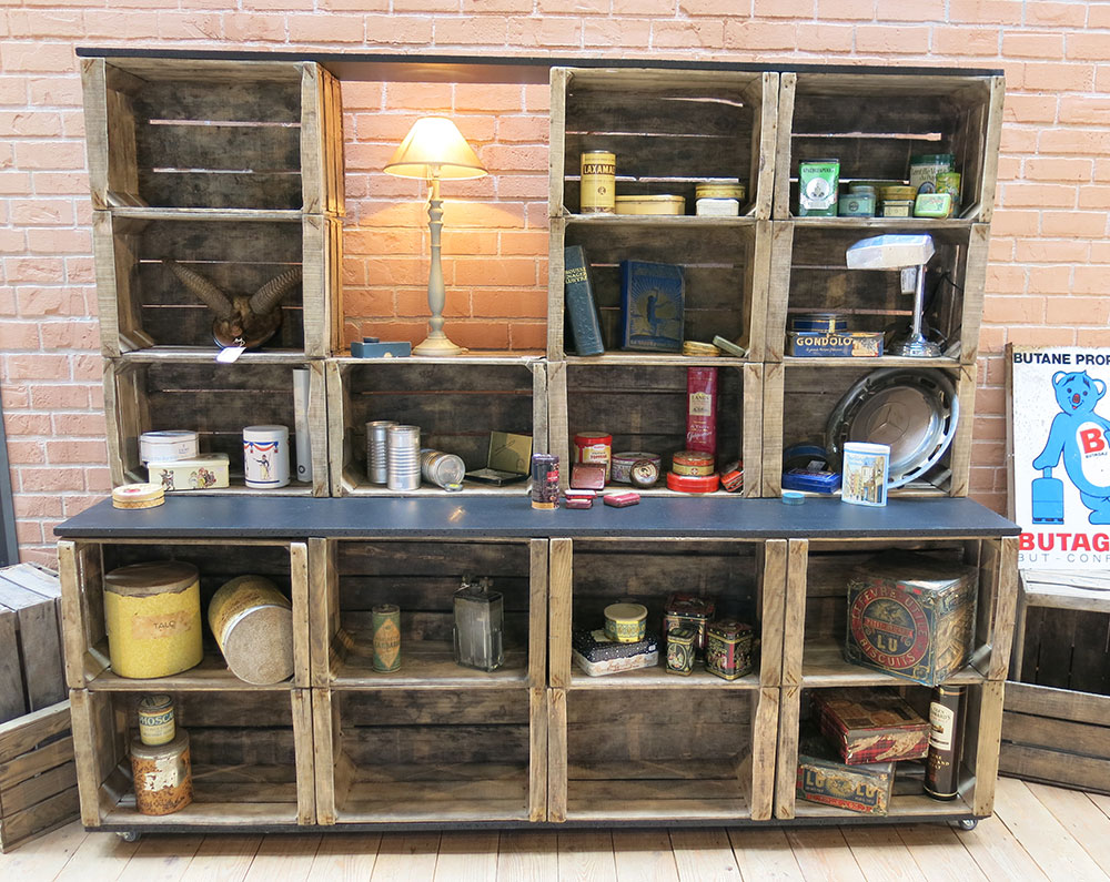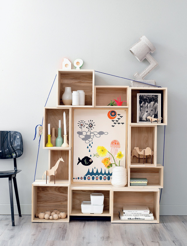 Perché non giocare con cassette chiare e cassette scure, piccole o più grandi? Così facendo, potrete realizzare un mobile a scaffali personalizzato. Di volta in volta, avrete la possibilità di aggiungere nuove casse e sviluppare il vostro progetto.