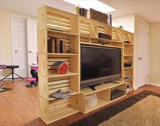 Le cassette di legno si prestano a tantissime soluzioni creative. Una di queste può essere la seguente. Un pratico e grazioso divisorio, utile anche come mobile TV, per separare il soggiorno in due zone. Idea perfetta per chi ha un open space, ma desidera ricavare più aree, senza spendere un capitale.