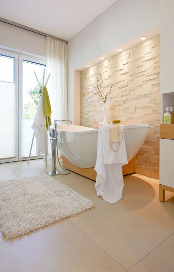 La scelta della pavimentazione di legno è azzeccata, perché l’aura di naturalità è d’obbligo in un bagno nel quale si vuol costruire un colpo d’occhio così lampante. Nella seconda foto, la decorazione muraria è bianca, fatta di pietre sfalsate, illuminate da un fascio di luce, posta dietro la vasca. Sembra un palcoscenico che mette in mostra l’opera d’arte più bella.