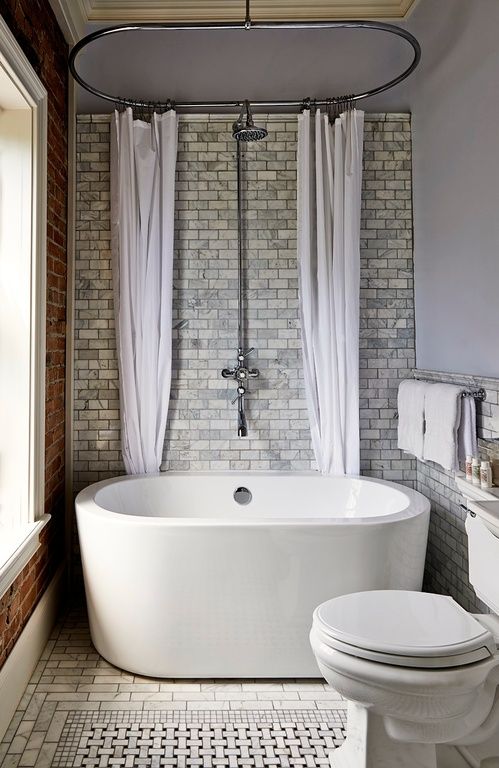 Sempre funzionale l’idea di unire vasca e doccia anche se, ovviamente, bisogna metterla in pratica con stile. In questo caso, la bella tenda bianca, che cammina lungo la struttura circolare sopra il soffione della doccia, quando è aperta fa pensare ad un tendaggio elegante, come quella di un salotto.