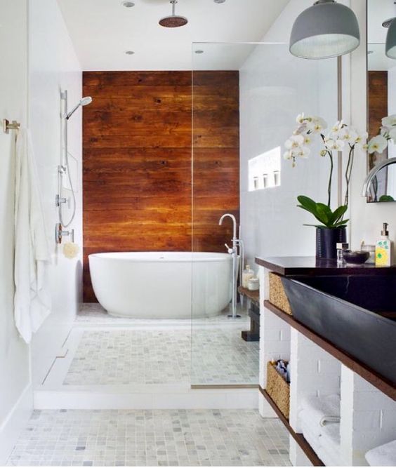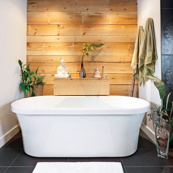Nella seconda foto, ancora una parete di legno che mette in risalto la vasca, che si trova subito dopo il piatto doccia, in un camminamento che non ha soluzione di continuità. Bella anche l’idea presente nella terza foto, che mostra una vasca incastonata in un ambiente di stampo esotico. Una parete di legno naturale, piante, canne di bambù e statuette indiane, quasi a creare un luogo sacro, nel quale ritrovare se stessi.