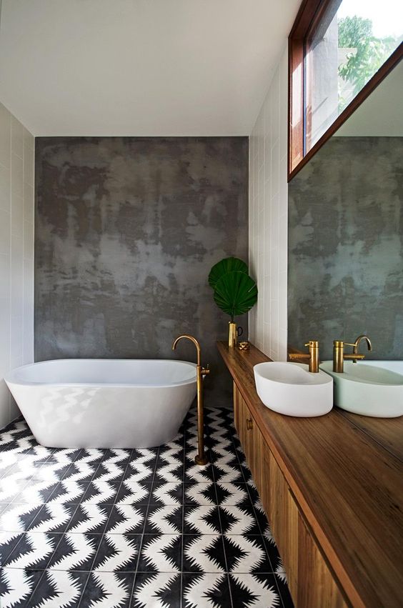 Pavimentazione nera, con lunghe decorazioni bianche, parete di cemento grigio dietro la vasca candida: ecco una soluzione decorativa glamour, che mette in risalto questo sanitario. Il lavabo, poggiato su un lungo top di legno, lineare e moderno, crea un effetto visivo importante, spostando continuamente l’attenzione da un elemento ad un altro.
