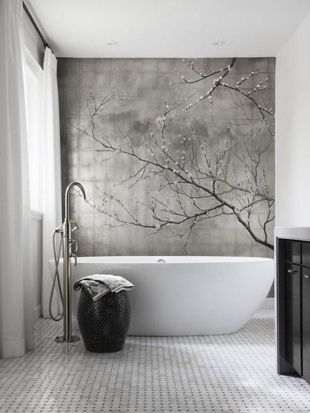 Anche una carta da parati grigia con un bel ramo fiorito, può fare da proscenio ad una vasca bianca in un bagno dalle linee essenziali e contemporanee. Gli arredi scuri regalano una sensazione di ordine ed eleganza davvero fuori dal comune.