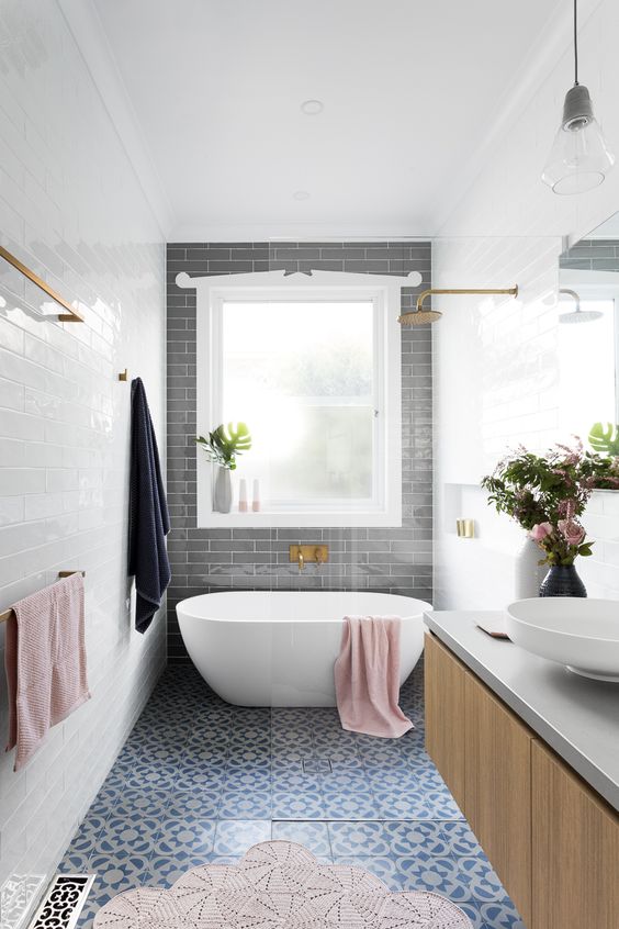 Un bagno stretto e lungo, che termina con una vasca bianca, essenziale. La finestra è circondata da una cornice di mattoni grigi che continuano sulla parete dietro la vasca, mettendola in risalto. La pavimentazione è a fiori, con l’azzurro, di stile completamente diverso da quello che caratterizza l’intera stanza, la quale possiede un’ispirazione sicuramente moderna.