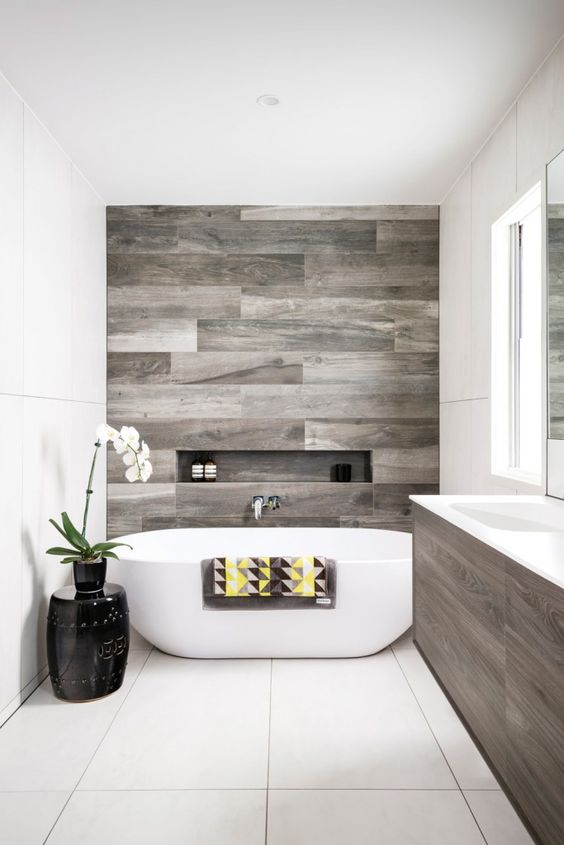 La parete grigia con la mensola sta dietro la vasca da bagno bianca e la valorizza al meglio. I mobili del lavabo riprendono la stessa tonalità della parete, creando una continuità elegante. Il vaso nero è un colpo d’occhio non indifferente, così come il bianco che caratterizza il resto della stanza. Una bella soluzione, valida anche per una stanza piccola.