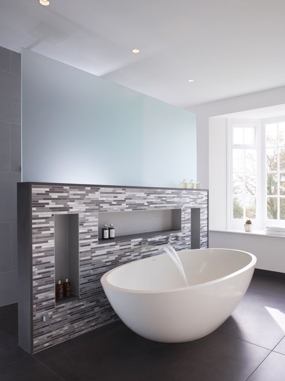 Bellissima questa struttura con nicchie che fungono da mensole, lungo la quale sta poggiata la vasca ovale. Il rubinetto, moderno, si trova all’interno della struttura stessa, decorata con mattoncini rettangolari in diverse tonalità di grigio. Un bell’effetto visivo e cromatico che risalta la vasca, anche grazie alla pavimentazione scura, che è base imprescindibile.