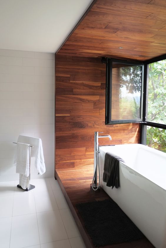 La vasca bianca, rettangolare, è qui inserita all’interno di una nicchia di legno che crea anche una pedana. La vasca è, dunque, sopraelevata rispetto al resto della pavimentazione, e si trova come in uno spazio apposito. La finestra, immediatamente sopra di essa, regala un respiro ampio. Il resto della stanza è bianca, essenziale. Il distacco cromatico è davvero d’impatto.