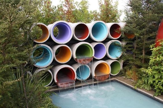 Ecco un progetto più imponente e scenografico, eppure meno bizzarro dei precedenti. Del resto, i tubi in calcestruzzo sono progettati apposta per incanalare l’acqua. Quale soluzione migliore che trasformarli in fontane destinate a riversare l’acqua in una piscina?