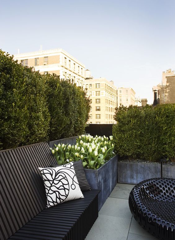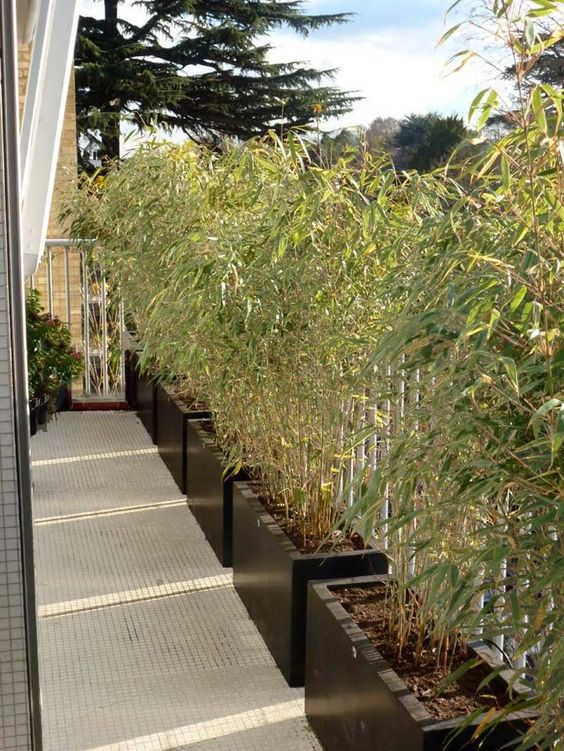 Piante artificiali, collocate in piccolissime fioriere di legno, poste lungo il perimetro del balcone. Una soluzione economica e sicuramente funzionale, dato che le piante in questione non necessitano di cure. Nella seconda foto, a schermare sono dei grossi cespugli sistemati in vasconi moderni, che coprono il balcone e ben si adattano all’arredo contemporaneo dello spazio esterno.