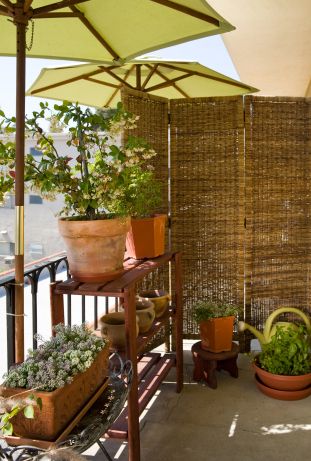 Un separé di rattan e due ombrelloni: ecco come ottenere una schermatura di prim’ordine. Una bella soluzione che si combina all’utilizzo di vasi e piante “ad hoc” sistemate davanti alla ringhiera del balcone.