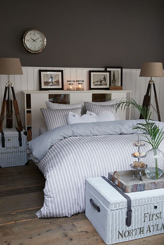 Qui, invece, vediamo tutto un’altro stile perfetto per zono di mare e non solo: quello marinaro. Ai piedi del letto è stato messo un cesto baule uguale ai comodini.