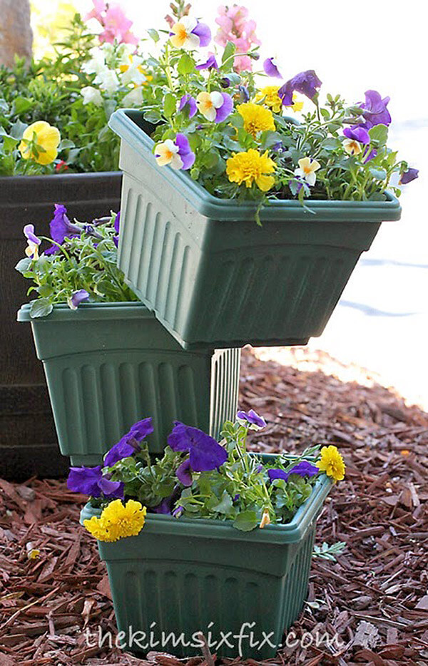 Le piante per arredare il giardino possono essere inserite anche in piccole fioriere di plastica con le quali è possibile creare una torre davvero originale. Se vi piace l’idea, vi consigliamo di non lasciarvi sfuggire la prossima immagine.
