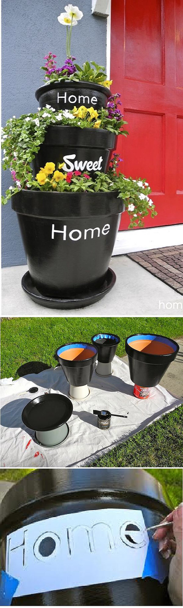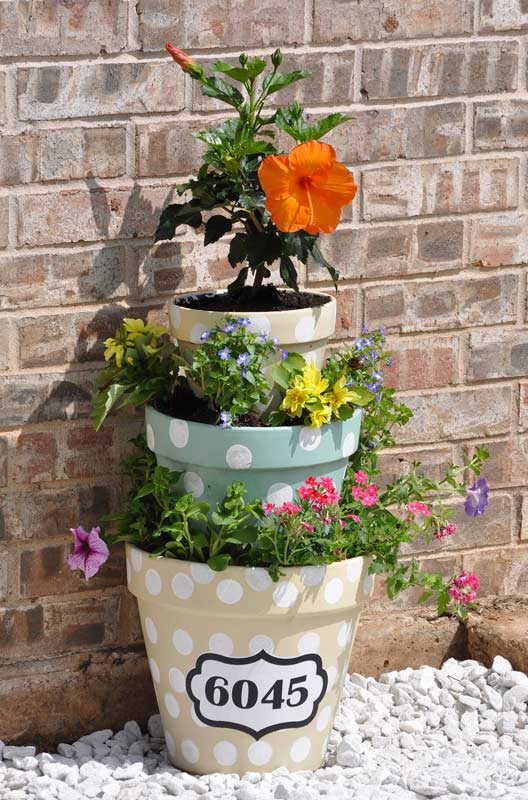 Se vi piace l’idea di personalizzare la torre di fiori nel modo che preferite, potreste ad esempio verniciare i vasi nel modo che più amate, così da renderli davvero unici, con scritte e colori a vostro piacimento. Dopo averlo fatto, potete inserirli uno sopra l’altro creando una torre, come nelle immagini che vi mostriamo di seguito.