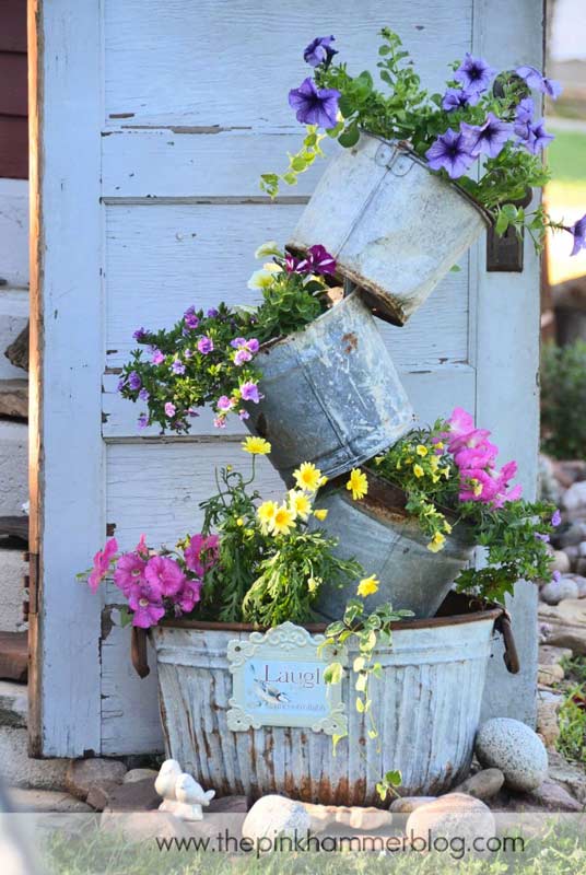 Tra le idee per il giardino economiche, vi proponiamo quella che vede la formazione di una torre di fiori con secchi di latta di varie grandezze da inserire l’uno dentro l’altro. In aggiunta, potete inserire in alto un vecchio innaffiatoio al cui interno piantate ciò che volete. In questo modo, la torre sarà ancora più originale.