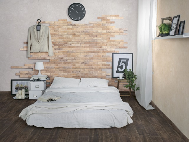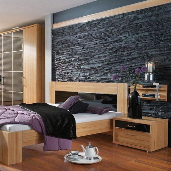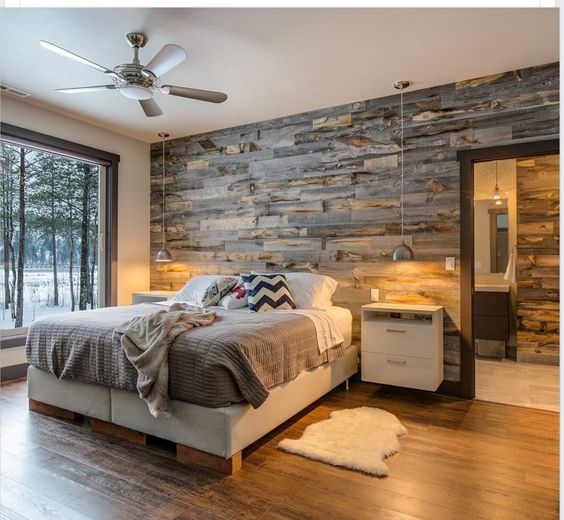 Avete una camera da letto interamente in legno? Potrete giocare con più elementi caldi e naturali per ottenere un impatto visivo armonico. Se una parete in pietra sembra troppo impegnativo, esistono in commercio rivestimenti in PVC che riproducono realisticamente l’effetto di un muro in pietra.