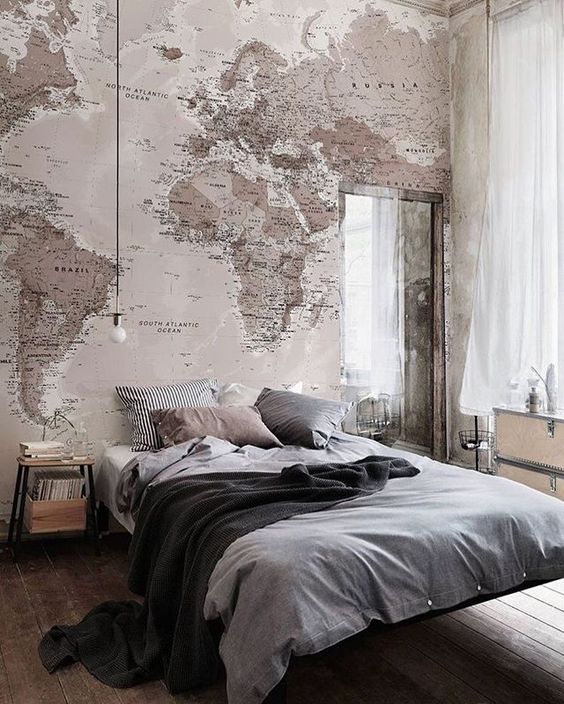 Concludiamo con un evergreen, una scelta che non passa mai di moda: la cartina geografica. Perché non utilizzare una carta da parati che raffiguri tutto il mondo per decorare la parete del letto? La soluzione ideale per gli spiriti nomadi, i viaggiatori sempre in cerca di una nuova meta da raggiungere.