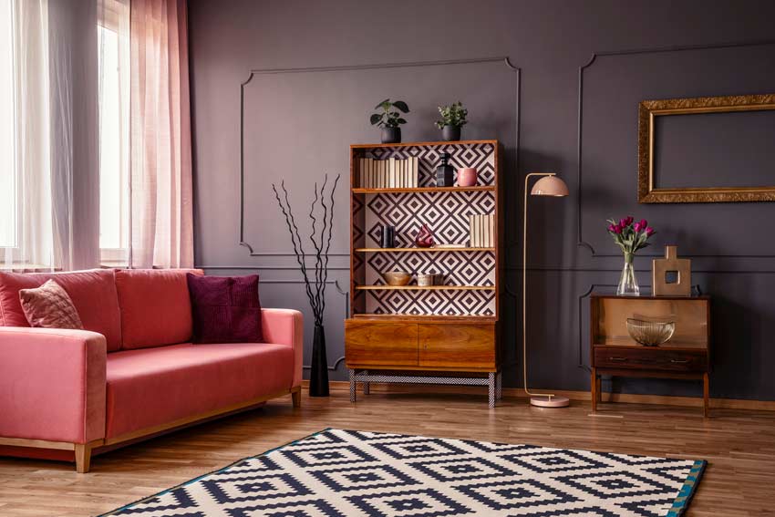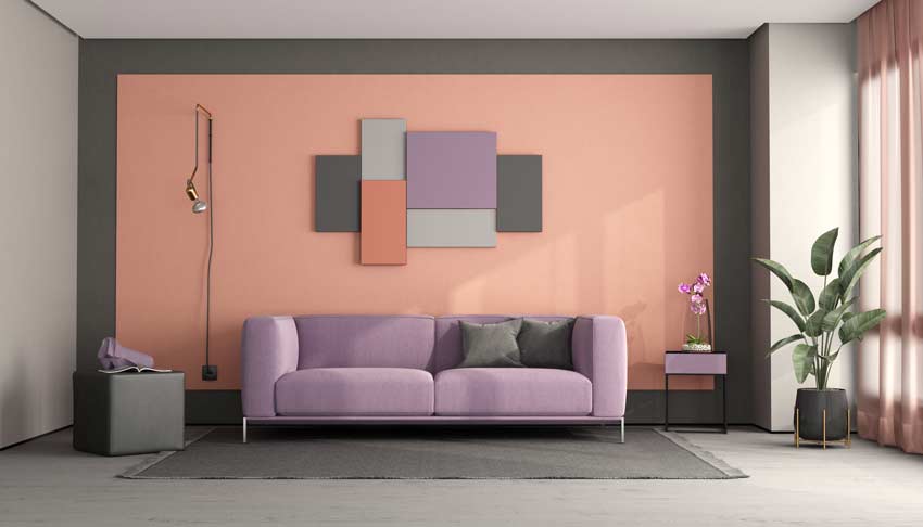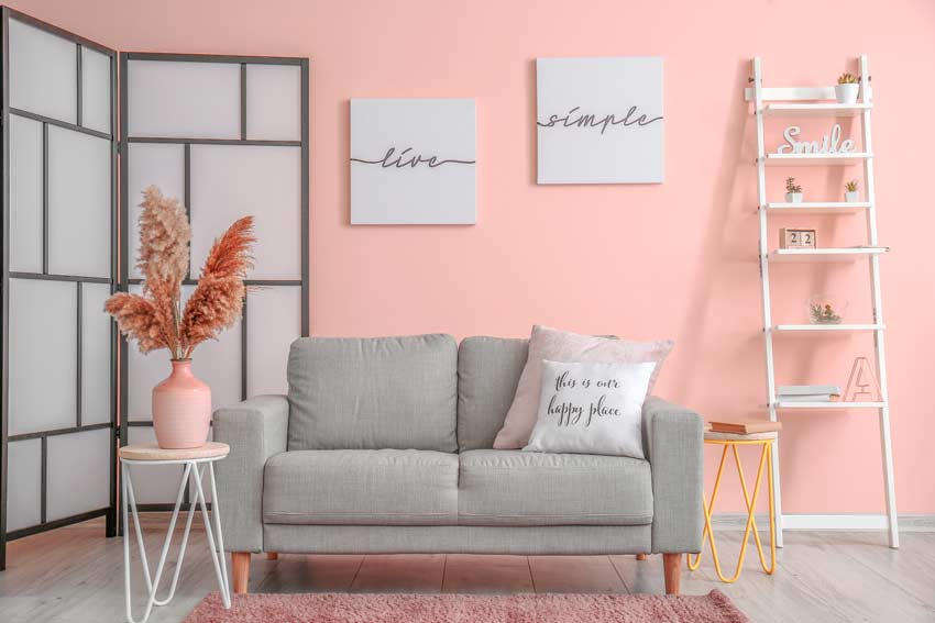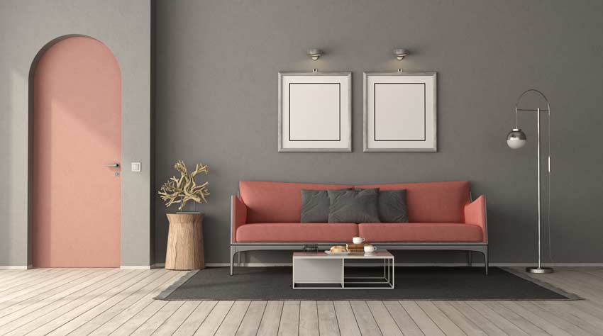 Nella prima immagine vediamo la presenza di grigio sulle pareti laterale, il pavimento, oggetti d’arredo e mobili. Il rosa è presente in minor misura, ma vediamo uno splendido divano, un quadro e anche un tavolino rosa. Il tutto è messo in risalto grazie alla parete color salmone.