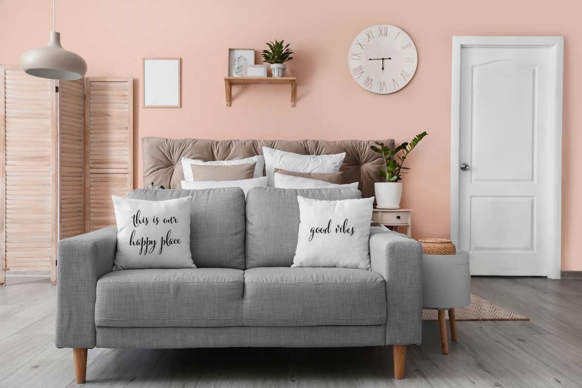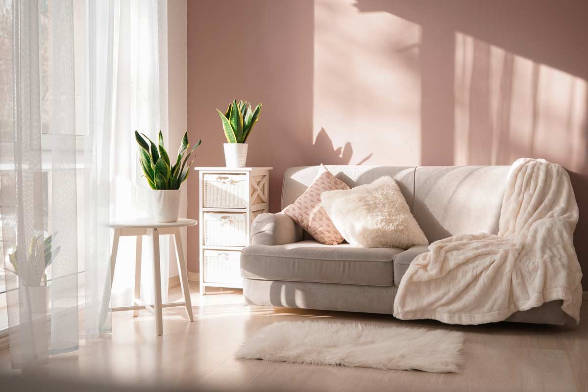 In questa immagine, invece, vediamo un soggiorno in stile contemporaneo molto luminoso tutto basato su tonalità chiare. Il divano grigio e la parete rosa chiaro si abbinano alla perfezione.