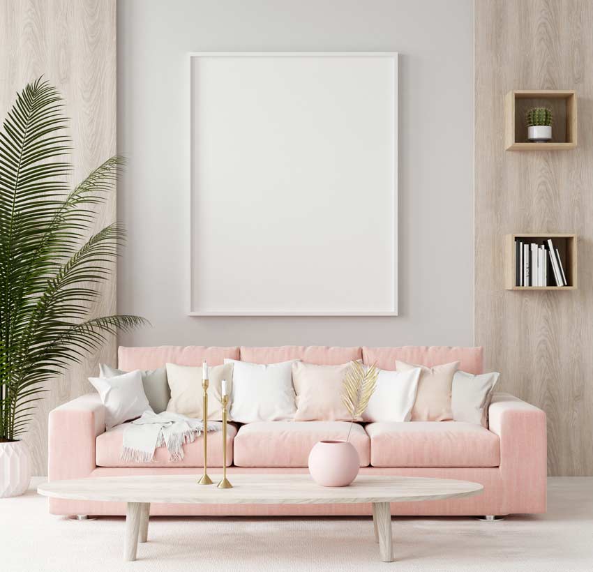 Ecco gli interni eleganti di un soggiorno con un comodo divano grigio. Il rosa è presente in diversi dettagli come i quadri e i cuscini.