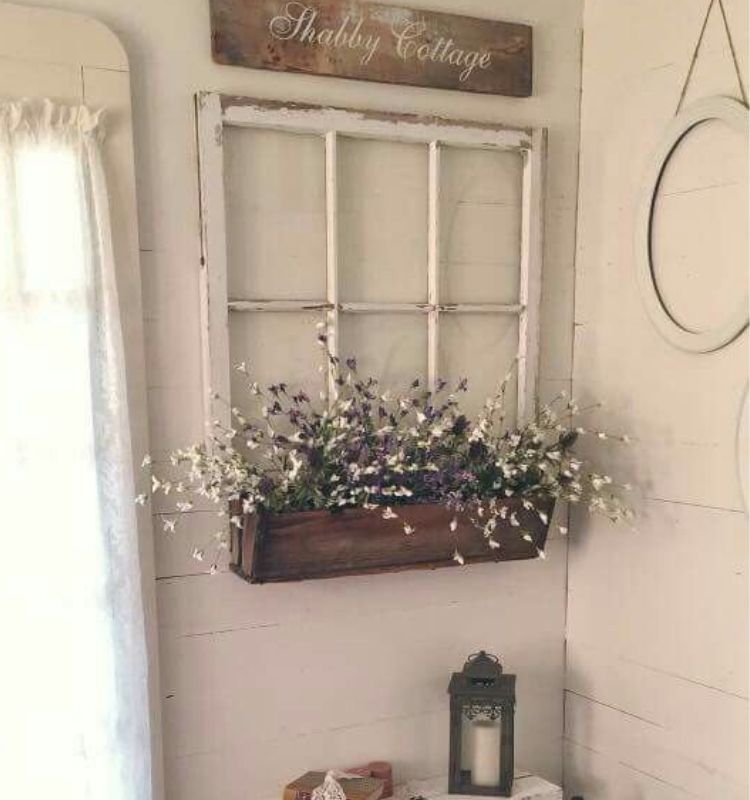 Come forse già sapete, una caratteristica fondamentale dell’arredamento Shabby Chic è la presenza di elementi di recupero. Nel caso di questo spunto, possiamo vedere la cornice di una finestra in legno trasformata in sostegno per un vaso di fiori.