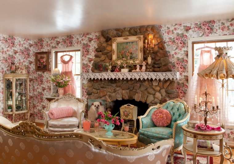 Ecco un soggiorno incredibilmente romantico che incarna alla perfezione lo stile country. Il camino in pietra s’integra bene con le fantasie floreali della carta da parati, creando un piacevole punto di rottura.