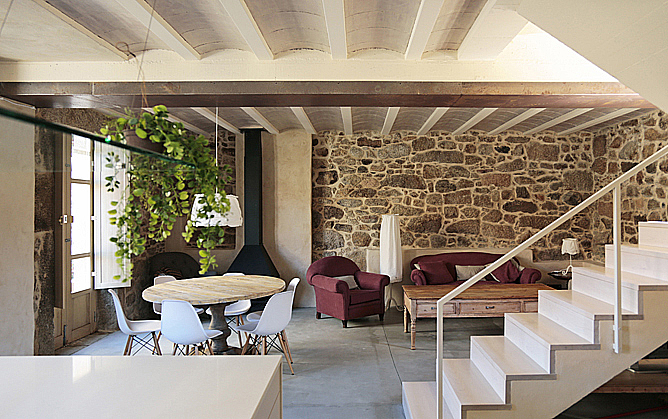 Se avete in mente un’atmosfera rustica e un po’ vacanziera, il progetto seguente non vi deluderà. Il soggiorno in pietra, qui, è accostato a travi a vista, un parquet e mobili in legno. Tutti elementi naturali che diffondono una sensazione di intimità e calore, interrotta piacevolmente da punti luce moderni.