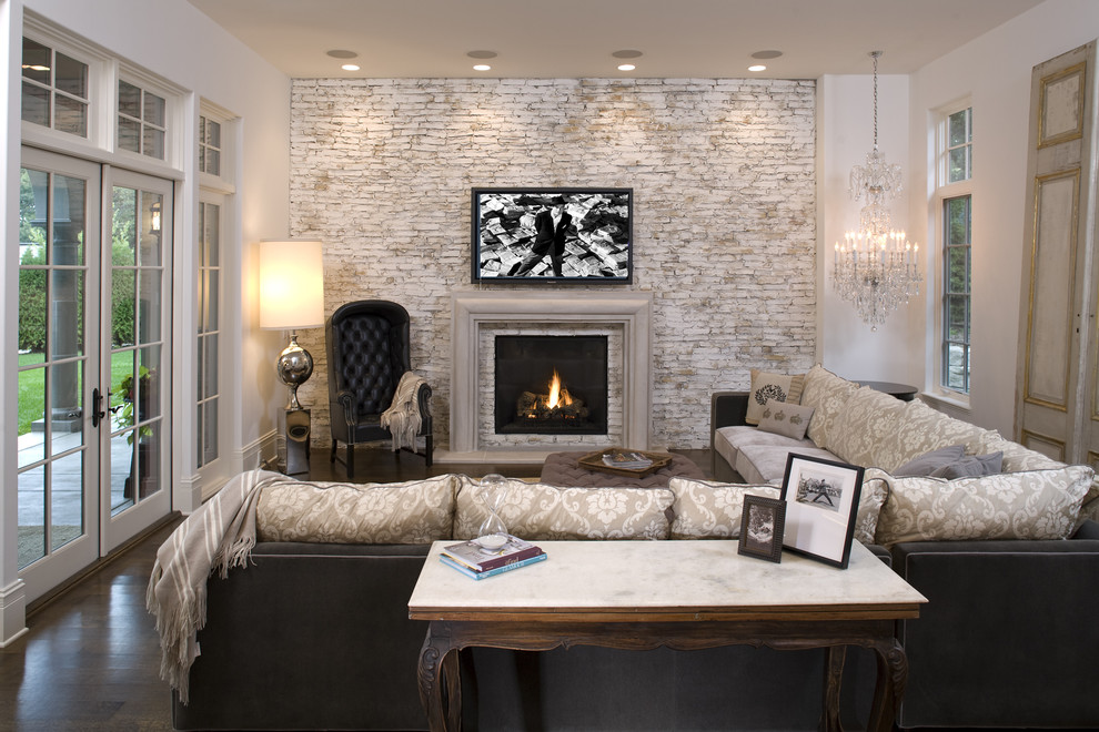 Desiderate un soggiorno più tradizionale? Questo rivestimento in pietra farà al caso vostro. La vicinanza delle vetrate e il soffitto bianco saranno la soluzione migliore per alleggerire l’insieme.