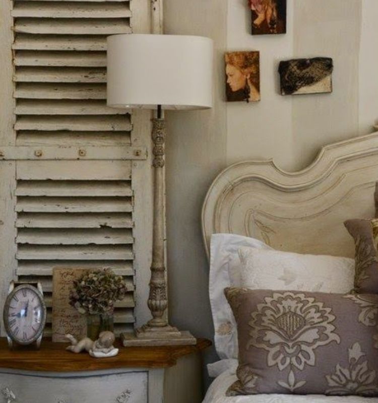 Uno degli aspetti più interessanti dello stile provenzale è il suo essere un approccio sostenibile all’arredamento. Negli interni di cui è protagonista, non mancano elementi di recupero come questa persiana che, nella foto, contribuisce alla struttura di un comodino.