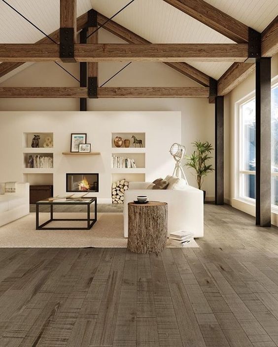 Quando il soggiorno ha travi a vista e pavimento in legno, il bianco diventa una scelta obbligata, per non rischiare un effetto pesante o poco armonioso. Non solo, Le pareti neutre riusciranno a valorizzare le qualità del legno, daranno più calore alla stanza intera.