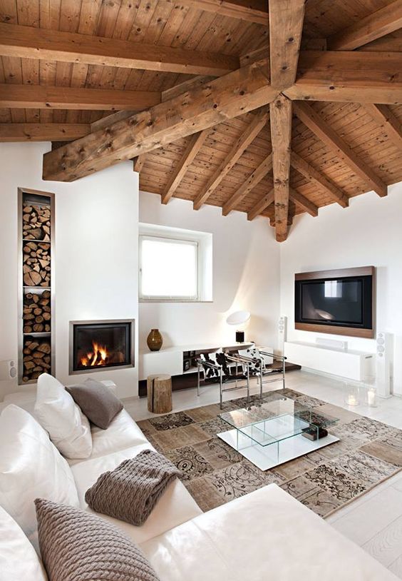 Al contrario, quando si desidera un’atmosfera calda e tradizionale, converrà restare all’interno dell’abbinamento di colori bianco e legno. A maggior ragione se si può godere di un soffitto importante con travi a vista. Per non correre il rischio di appesantire il soggiorno vi converrà optare per pareti bianche e mobili in vetro.