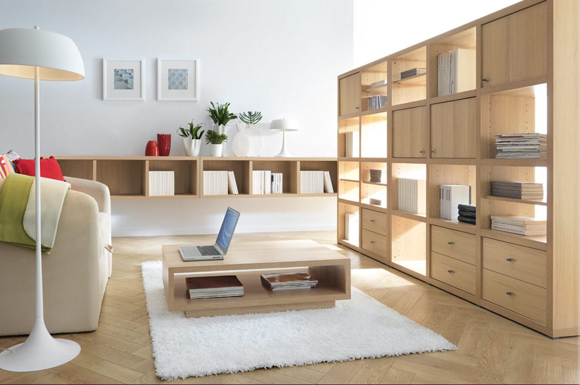 Ecco, invece, una soluzione moderna e più armoniosa. A fare la differenza, qui, è la scelta di un legno chiaro, più delicato, che si armonizza alla perfezione con il bianco delle pareti e dei complementi d’arredo. La libreria con scomparti aperti diventa un divisorio capace di filtrare la luce e decorare l’ambiente con stile.