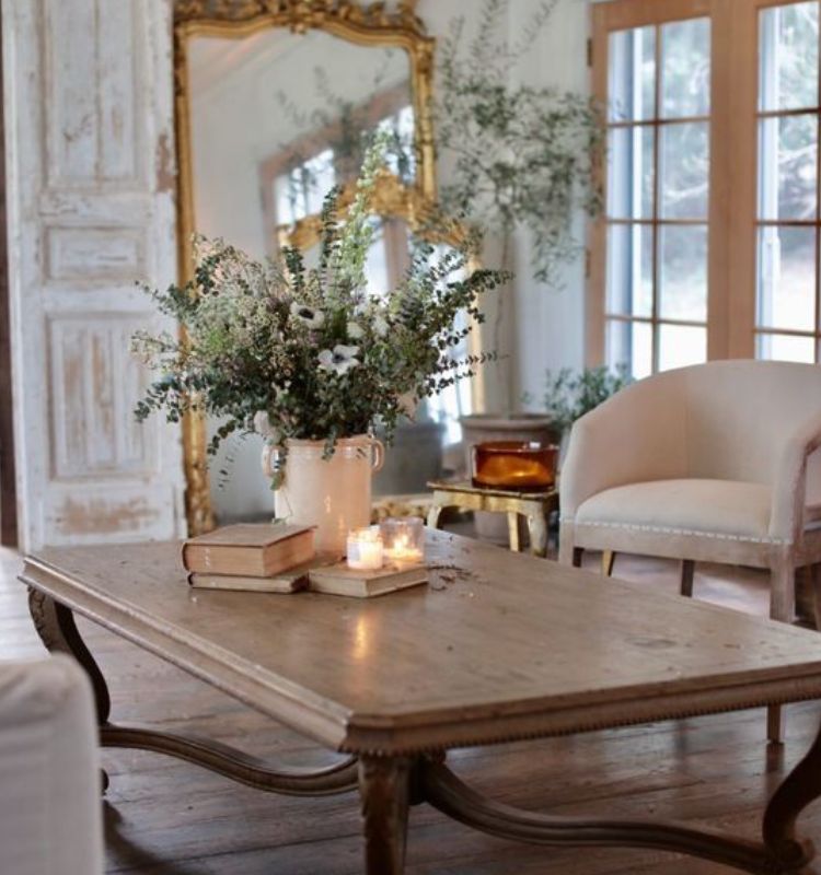 In un ambiente living arredato in stile country provenzale non possono mancare gli specchi. L’optimum prevede il fatto di sceglierli di grandi dimensioni.