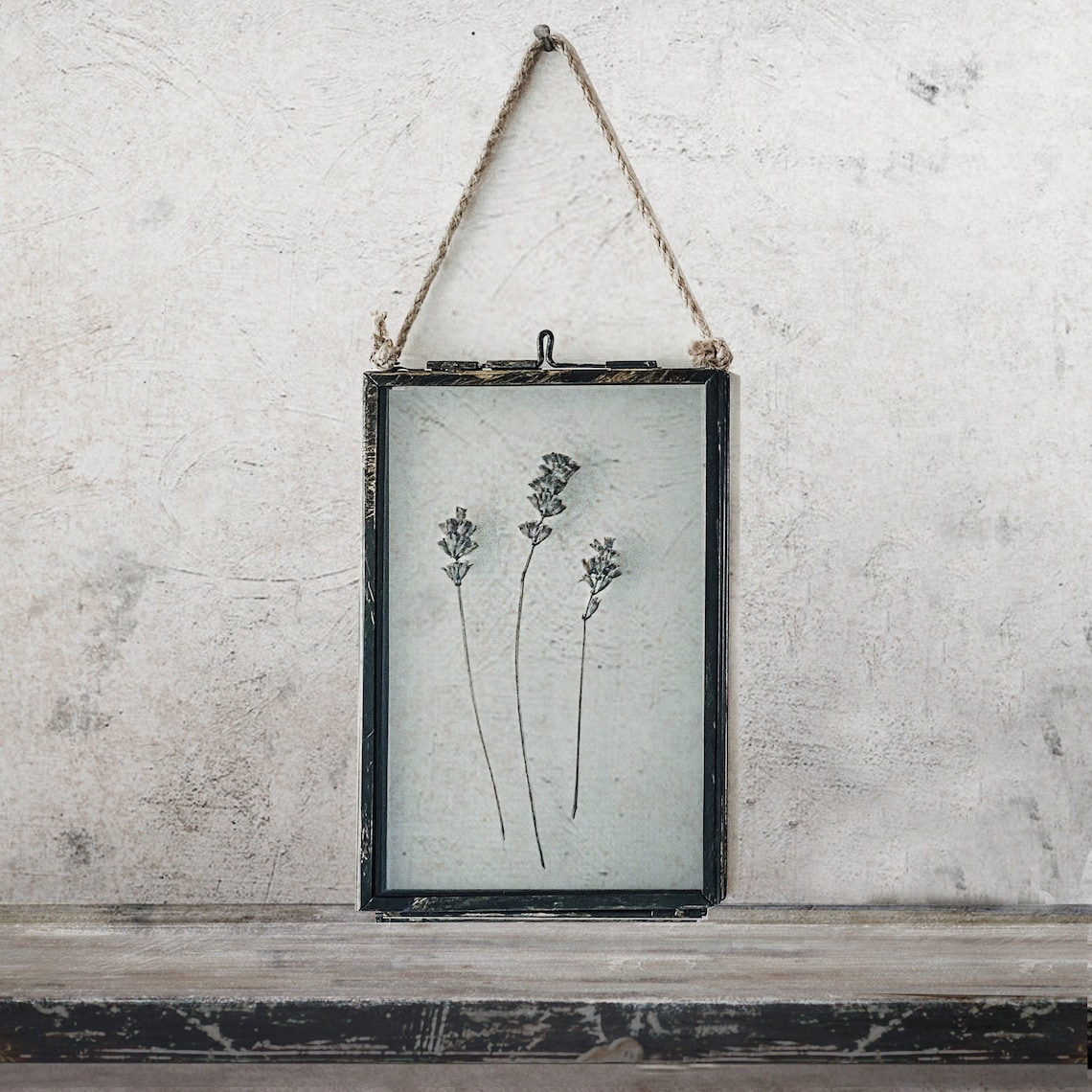 Bastano tre fiori di lavanda, una cornice dall’aria vissuta e uno spago per realizzare una suggestiva decorazione in stile shabby chic. I materiali poveri, le imperfezioni studiate ad arte si abbinano alla perfezione le grazie di questi fiori.