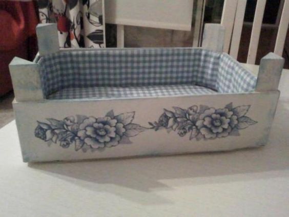 Con la base di una cassetta della frutta e alcuni elementi di decoupage è possibile creare un vassoio. Tagliere le parti in eccesso dalla cassetta e scegliere le immagini che si preferiscono per incollarle con la colla vinilica.