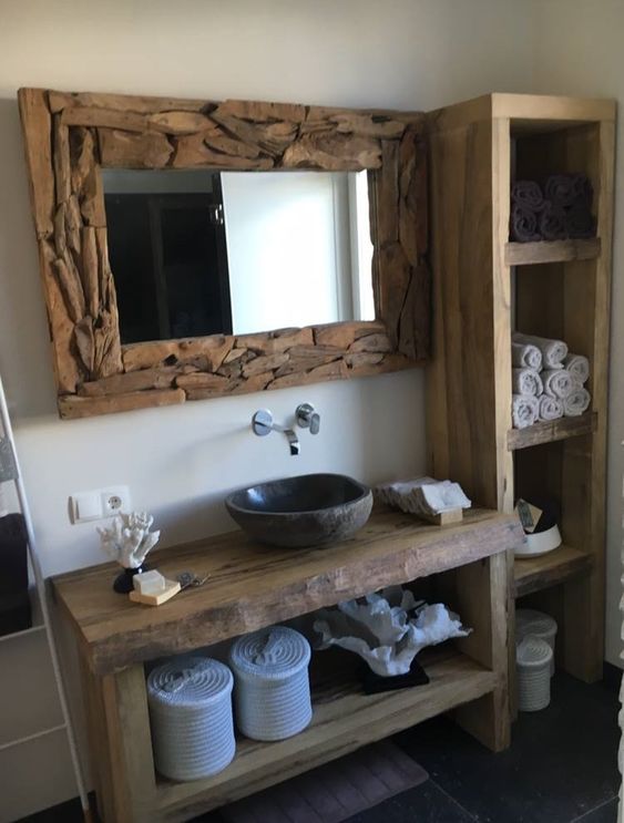 Una cornice di legno e un piano d’appoggio ligneo per il lavabo. Questo bagno è rustico ed essenziale e comunica un senso di grande calore e di praticità al contempo.