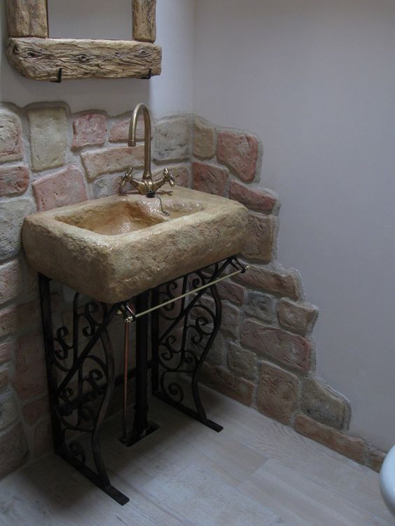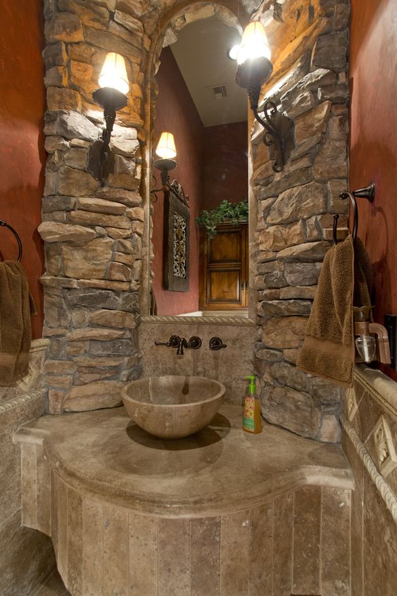 Pietra e marmo per questo bagno rustico dal piglio monumentale, che è di grande impatto scenico. La parete col rosso/mattone valorizza enormemente tutto il contesto. Le luci illuminano sapientemente la struttura in pietra che circonda lo specchio.