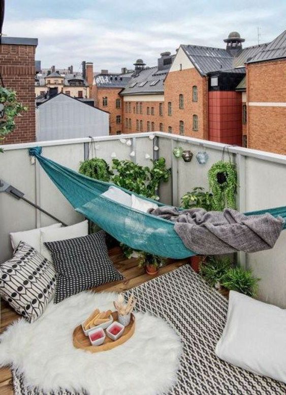 Sul vostro balcone piccolo potete addirittura metterci una bella amaca che sarà il sogno di grandi e piccoli. Basta sceglierne una di dimensioni adatte e posizionarla in modo che lasci spazio anche ad altri arredi. Mettetela in un angolo, sfruttando la ringhiera o il parapetto esterno per agganciarla.
