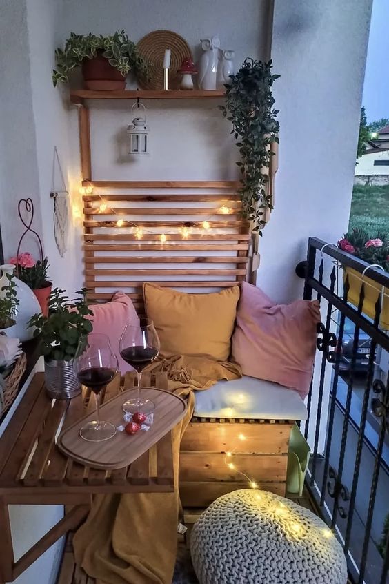 Pallet per creare un comodo divano che è anche fioriera verticale e un bel pouf che comunica calore e intimità. Poi piante, un tavolino pieghevole per consumare i pasti, morbidi cuscini e un filare di luci che la sera illuminano con levità. Il vostro balcone piccolo non potrebbe essere più invitante.