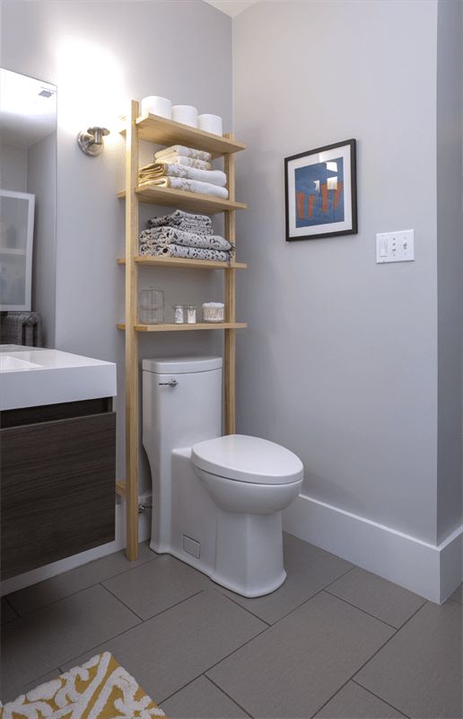 Anche l’uso di scaffali è molto appropriato. Possono contenere prodotti per l’igiene, soprammobili, profumi, ecc., e consentono di utilizzare la stanza in modo più spazioso, senza bisogno di mobili aggiuntivi.