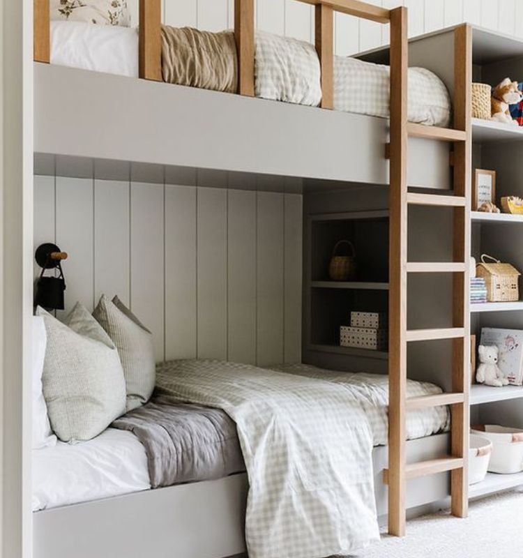 Quando la cameretta piccola viene condivisa da due persone, la soluzione più funzionale è quasi sempre quella dei letti a castello. La struttura di legno della foto comprende altresì un vano libreria, che ottimizza ancora di più lo spazio a disposizione.
