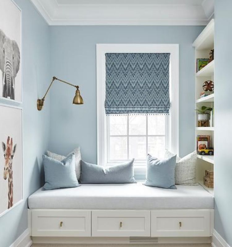 Il letto sotto la finestra funge anche da divano. Riempitelo di cuscini grandi e comodi. Sfruttate la luce che proviene dalla finestra, per farne una zona relax non solo per dormire. La bella libreria laterale accoglie tanti libri e non solo, e la lampada sulla parete opposta fa luce la sera, quando il sole cala. Il tutto, addossato su di un’unica parete della stanza. I colori pastello, tenui e lievi, contribuiscono a rendere più spaziosa la stanza.