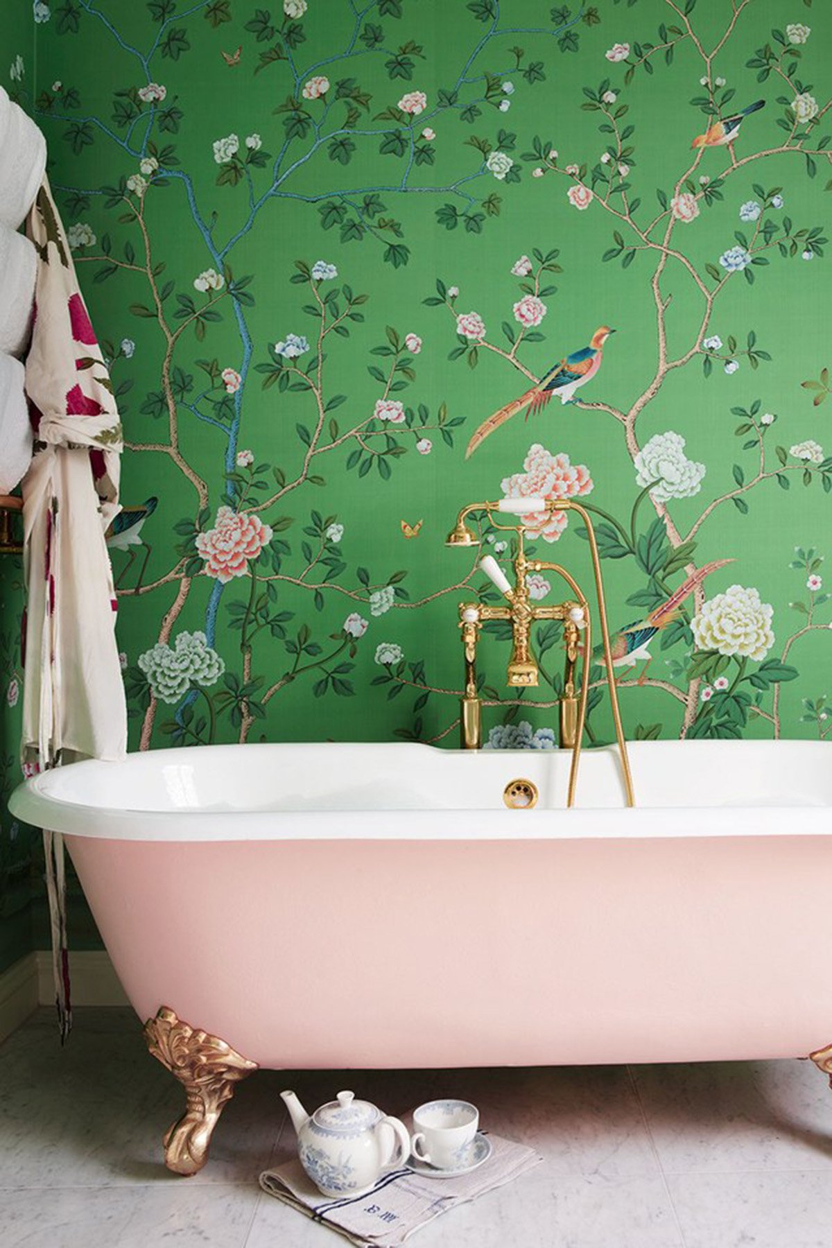 La carta da parati rétro con i motivi floreali, tanto in voga negli anni ’60 e ’70, accostata a una vasca da bagno rosa con i piedini di metallo. Ecco degli elementi distintivi decisi e pieni di carattere per un bagno vintage decisamente più stiloso.