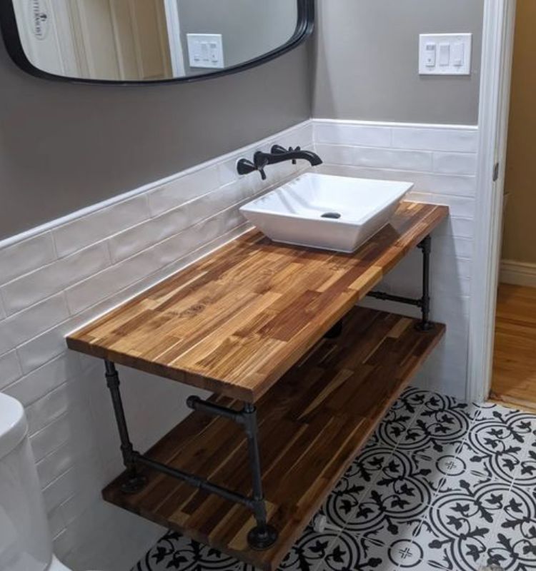 Concludiamo la nostra rassegna di consigli dedicati a chi è alla ricerca di rivestimenti originali per la stanza da bagno con questa soluzione effetto legno. Vi piace? Noi la troviamo incantevole! Il contrasto con il resto del muro di colore grigio scuro rende il tutto ancora più affascinante ed elegante.