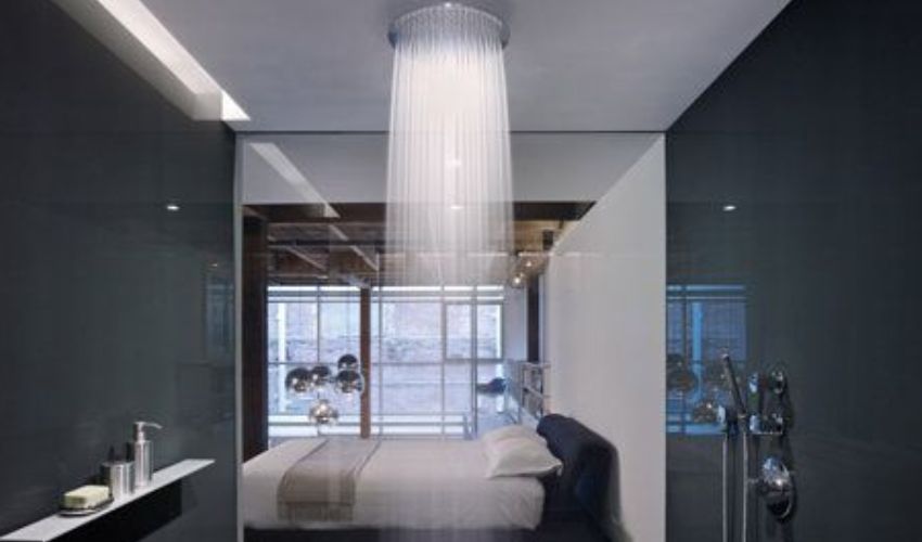 Un letto vista doccia, quest’ultima caratterizzata da un ampio soffione. A separare i due ambienti solo un vetro, dettaglio che rende il tutto ancora più ricco di fascino.