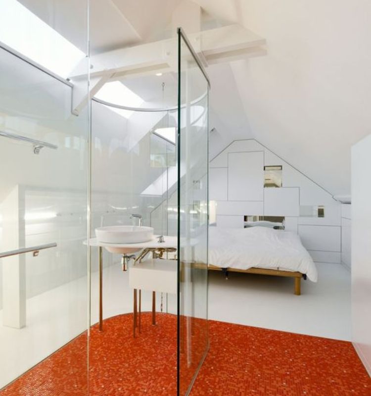 Concludiamo questo nostro piccolo viaggio alla scoperta delle idee per chi vuole mettere assieme stanza da bagno e letto con una soluzione che è a dir poco lussuosa. Il vetro è ancora una volta protagonista con forme morbide in contrasto con la potenza del nero, colore scelto per il pavimento del bagno. Per quest’area è stata scelta una stupenda vasca bianca, ideale per ore e ore di relax. Non è stupendo? Noi lo troviamo incantevole.
