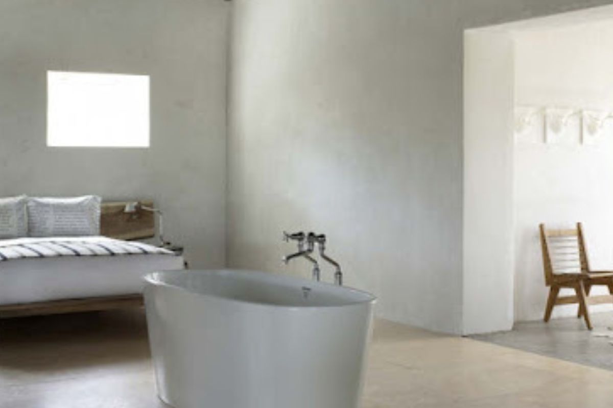 Ecco una proposta che vede in primo piano un approccio estetico semplice. Non abbiamo una vera e propria stanza da bagno ma un’elegantissima vasca di fronte al letto.